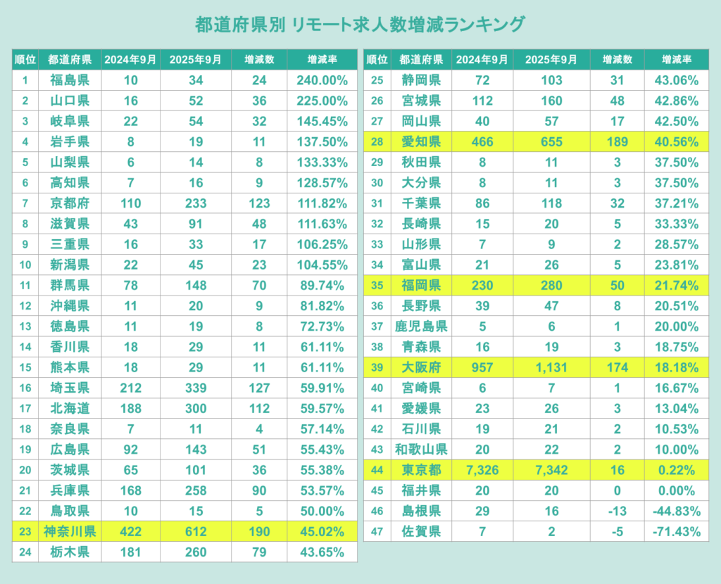 ただし、東京は44位と低く、神奈川・愛知・千葉・大阪といった大都市圏も上位には入っていません。都市部より地方でリモート求人が伸びている傾向が見て取れ、地方での採用活動においてリモート勤務が競争力強化の一要素になりつつあると考えられます。
