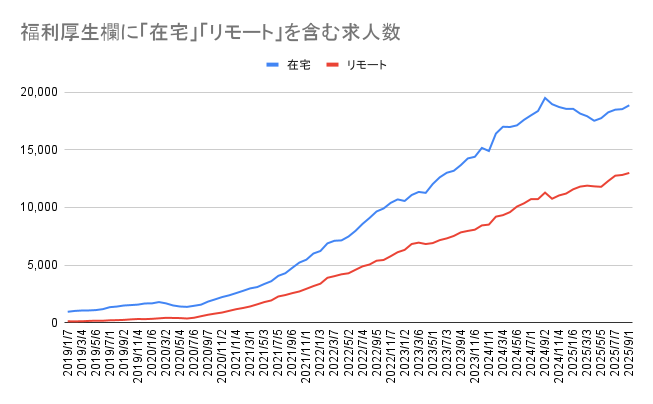 「在宅」というキーワードを含む求人件数は、2025年9月初週時点で18,860件に達しており、同時期のリモート求人12,995件を上回っています。