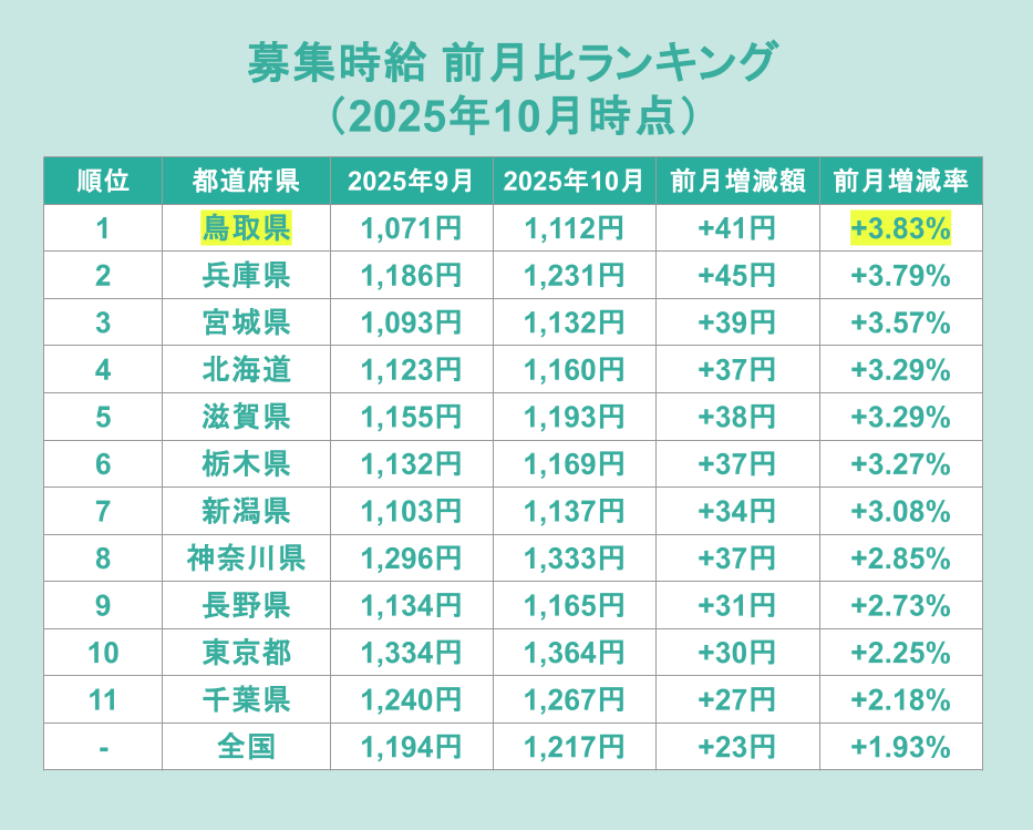 まず、2025年10月時点の募集時給が前月比でどのくらい上昇したか分析します。上昇率を都道府県別にランキングで見てみると、調査時点で最大となる73円の引き上げを施行した鳥取県が+3.83%で1位となりました。次いで兵庫県が+3.79%、宮城県が+3.57%と続いています。募集時給の水準がもともと高い東京都などの首都圏は、下位のランクインとなりました。
