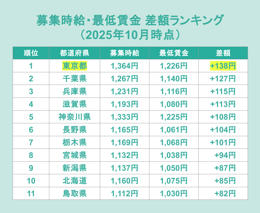 続いて、2025年10月時点の募集時給が、最低賃金に対してどのくらい上乗せされているかをランキングで分析します。1位には東京都が差額+138円でランクイン。続いて、千葉県が+127円、兵庫県が+115円となり、首都圏をはじめとする賃金水準の高いエリアが上位となりました。
