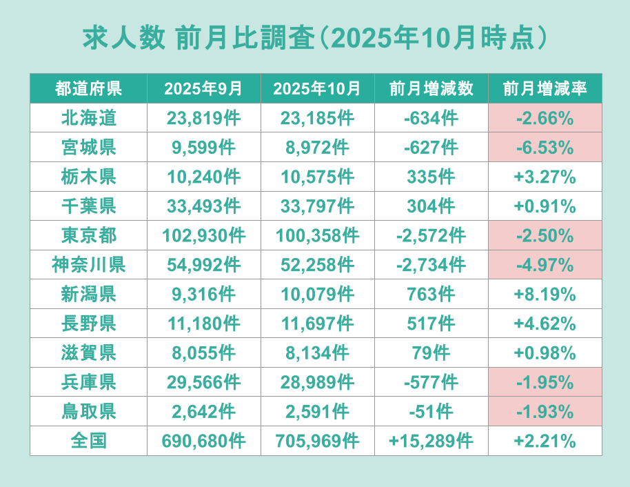 最後に、2025年10月時点の求人数が前月比でどのように変動したかを調査してみます。全国平均では+2.21%増加したのに対し、今回最低賃金の改定を行った自治体では、半数近くで求人数が前月から減少しています。