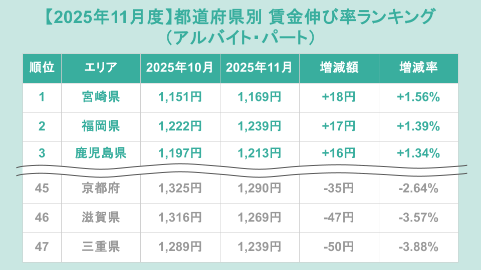 アルバイト・パートの都道府県別賃金伸び率ランキング(前月比)トップ3は、1位が宮崎県(増加額+18円、増加率+1.56%)、2位が福岡県(増加額+17円、増加率+1.39%)、3位が鹿児島県(増加額+16円、増加率+1.34%)でした。