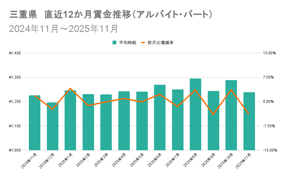 一方、三重県の平均時給は2024年11月時点で1,226円、その後は上昇基調で推移し、2025年8月には1,295円と期間中の最高値を記録しましたが、11月は大きく下落し1,239円となっています。