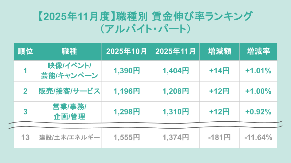 2025年11月度の職種別 賃金伸び率ランキングを発表しました