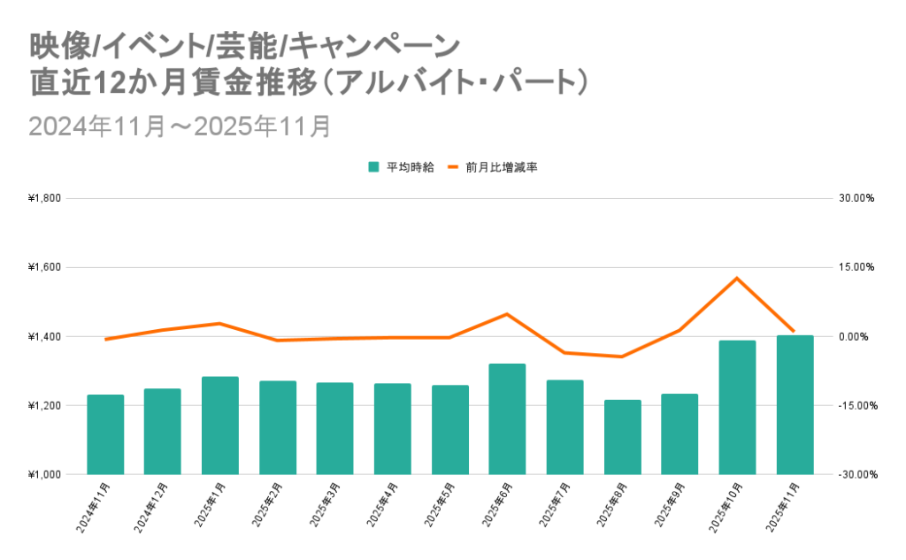 1位の「映像/イベント/芸能/キャンペーン」と13位の「アミューズメント」における直近12か月の賃金推移を比較すると、「映像/イベント/芸能/キャンペーン」では複数の企業がイベントスタッフ系の高時給求人を出稿した影響で、2025年9月から同年10月にかけて平均時給が大きく上昇。2025年11月においても同様の求人の影響により、2ヵ月連続でランキング1位となりました。