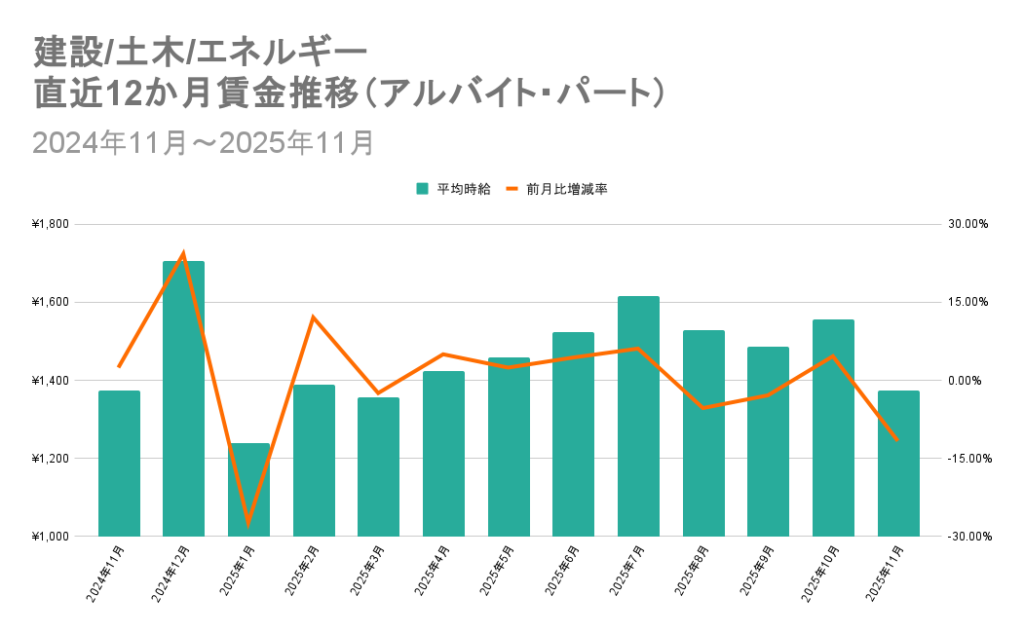 「建設/土木/エネルギー」では、株式会社ケイ・マックスが時給2,333円の求人を2024年12月と2025年7月に大量出稿。特に2024年12月には600件を超える出稿があり、これにより平均時給が大きく上昇しました。出稿が減少した2025年1月には平均時給も減少し、以後は増減を繰り返しながら推移しています。