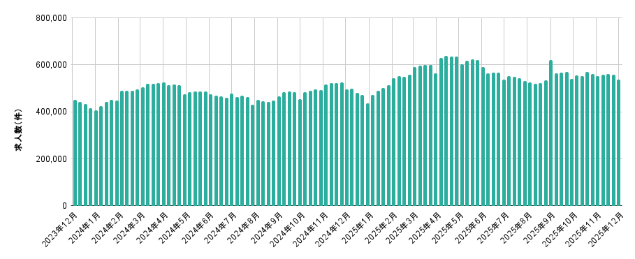 ■12月度の全国アルバイト・パート求⼈数は、537,568件(前⽉⽐-14,838件、前年同⽉⽐+41,937件)で前月から2.69%減少、前年同月から8.46%増加した。【図2】
