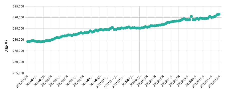 ■12月度の全国正社員平均月給は、291,490円(前月比+1,430円、前年同月比+6,310円)で前月から0.49%増加、前年同月から2.21%増加した。【図1】