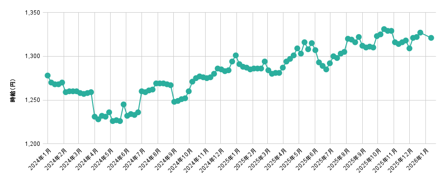 ■1月度の全国アルバイト・パート平均時給は、1,321円(前月比+12円、前年同月比+30円)で前月から0.92%増加、前年同月から2.32%増加した。【図1】