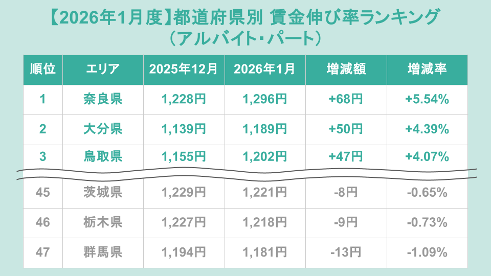 2026年1月度 都道府県別賃金伸び率ランキングを発表しました