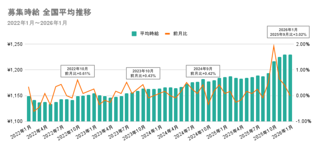 アルバイト系求人サイトにおける募集時給の全国平均を見ると、2025年9月の1,194円から2026年1月には1,230円へと上昇しました。