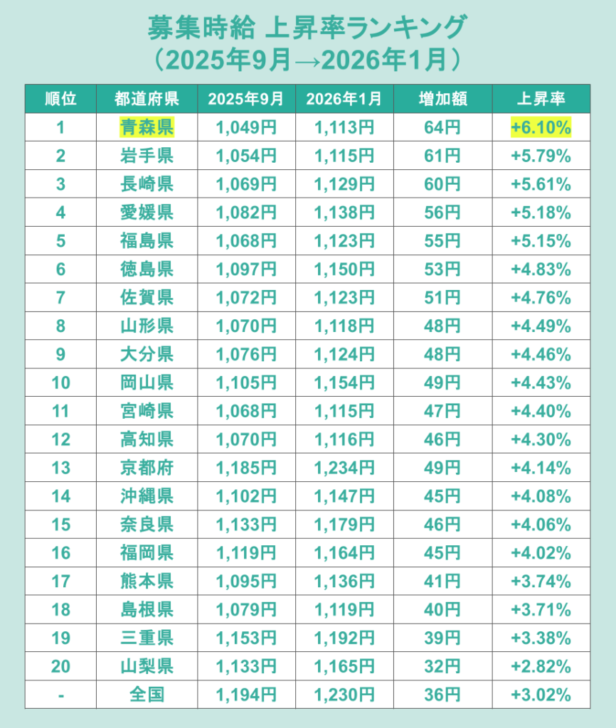 最低賃金改定前後となる2025年9月から2026年1月にかけての募集時給の上昇状況を都道府県別に見てみます。上昇率ランキングでは、青森県が+6.10%で1位となり、次いで岩手県が+5.79%、長崎県が+5.61%と続きました。
